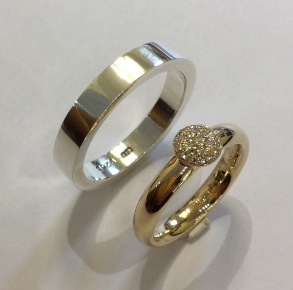 A set of wedding rings, where the women's ring in gold has a small "lozenge" on top adorned with small brilliants, and the men's ring is simple in its expression and made in silver.