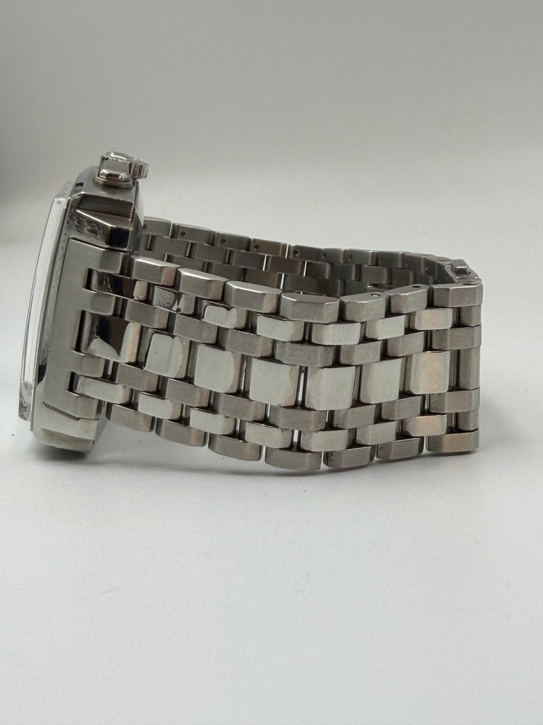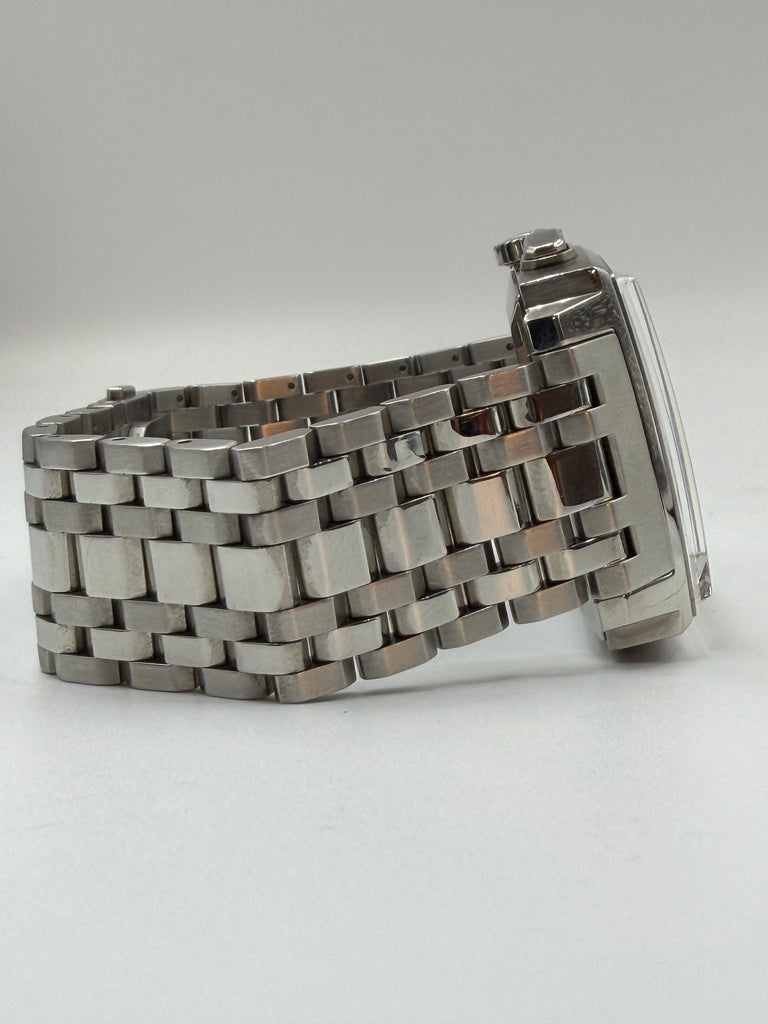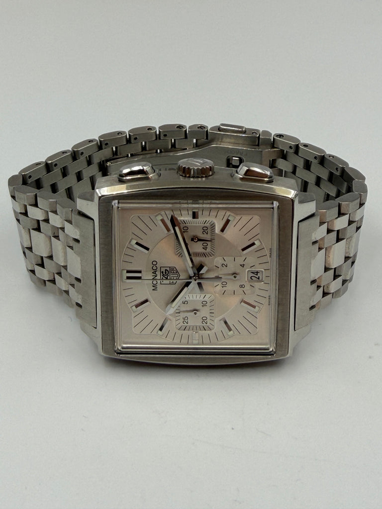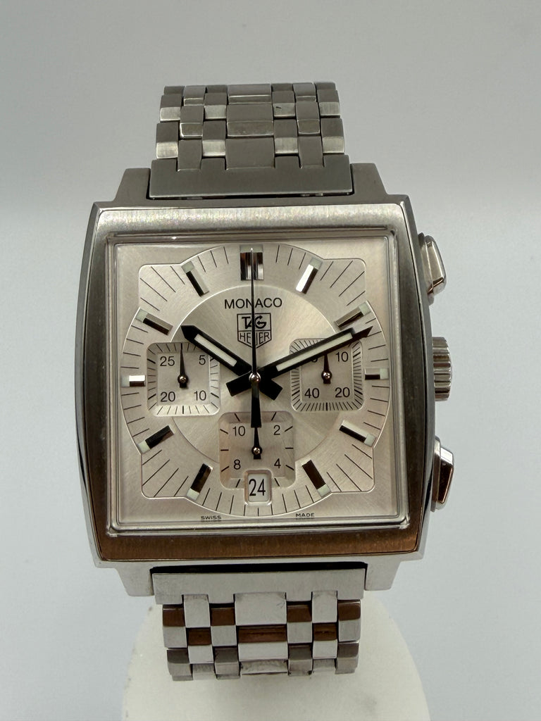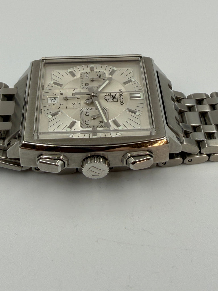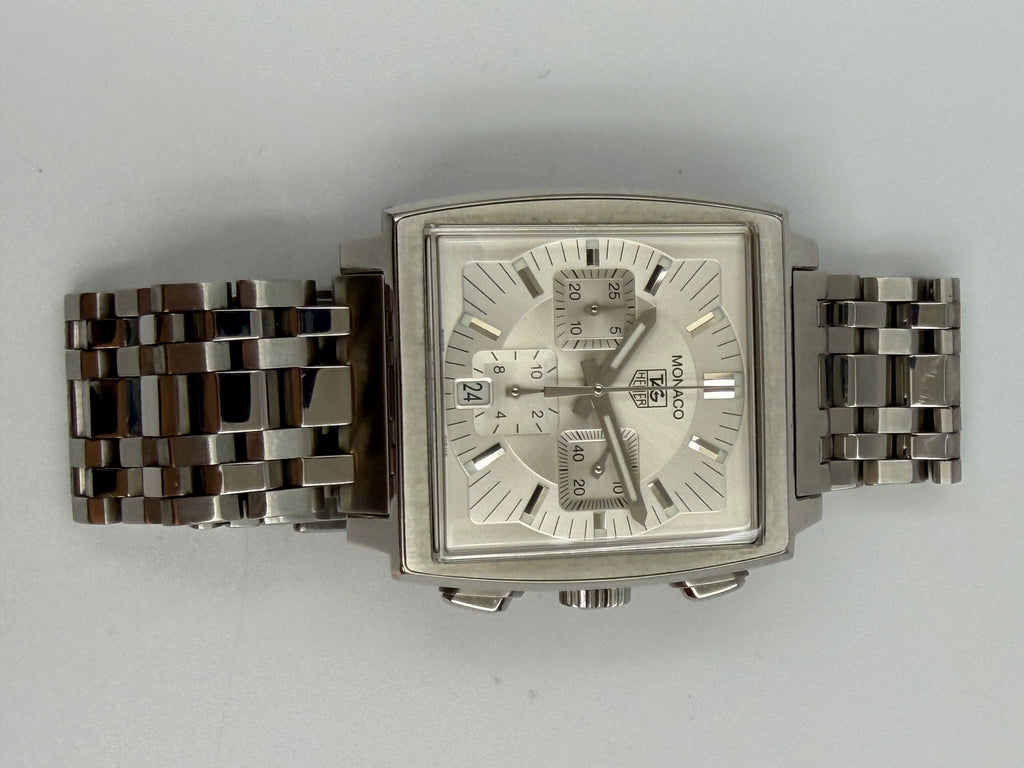 Tag Heuer Monaco Automatic. Silver dial with Chronograph and a small date window at six o'clock. Original steel bracelet mounted on that 39 mm square watch case. Condition on both watch and bracelet is like new.